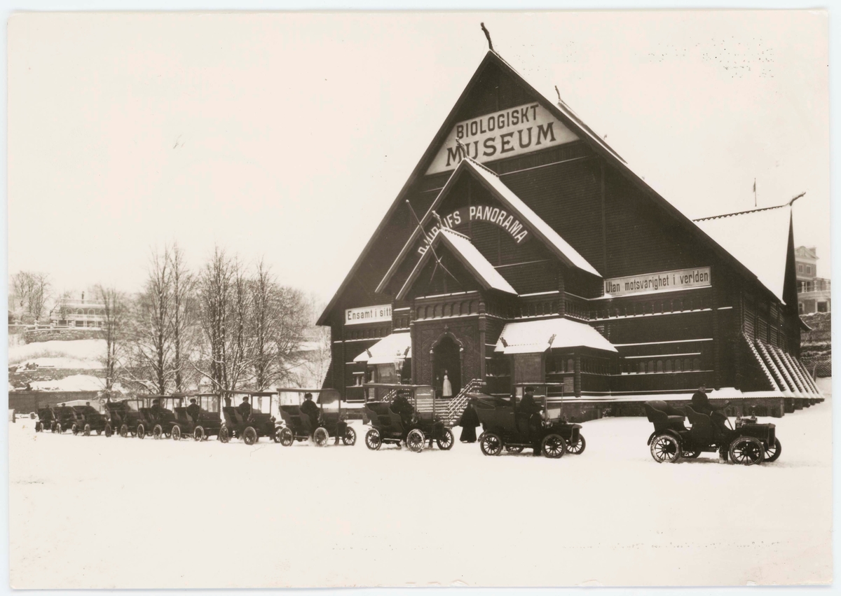 Vykort med motiv från Skansen. "Taxibilar utanför Biologiska Museet ca 1908." "Taxis outside the Biological Museum ca. 1908."