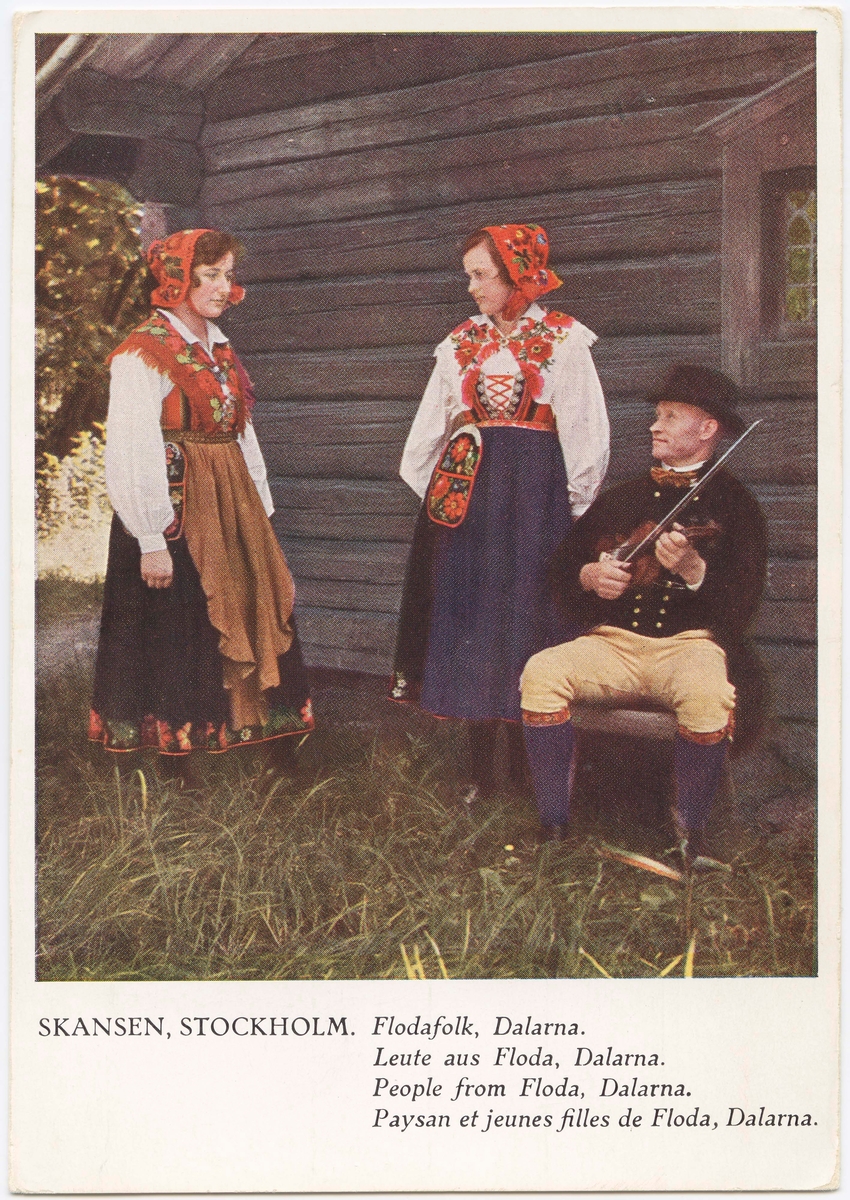 Vykort med motiv från Skansen. "Foldafolk, Dalarna." Två kvinnor och en man i Flodadräkter.