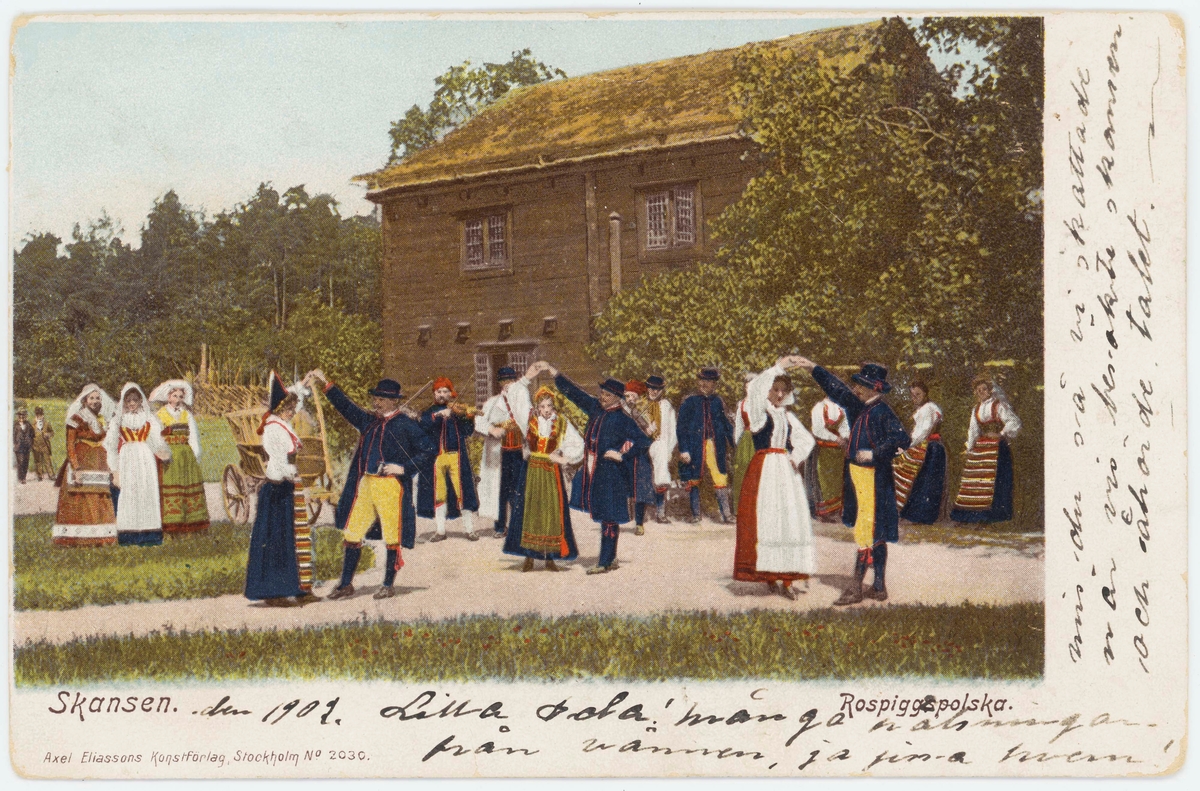 Titel: Vykort med motiv från Skansen. "Rospiggspolska." Folkdans utanför Kyrkhultstugan..
