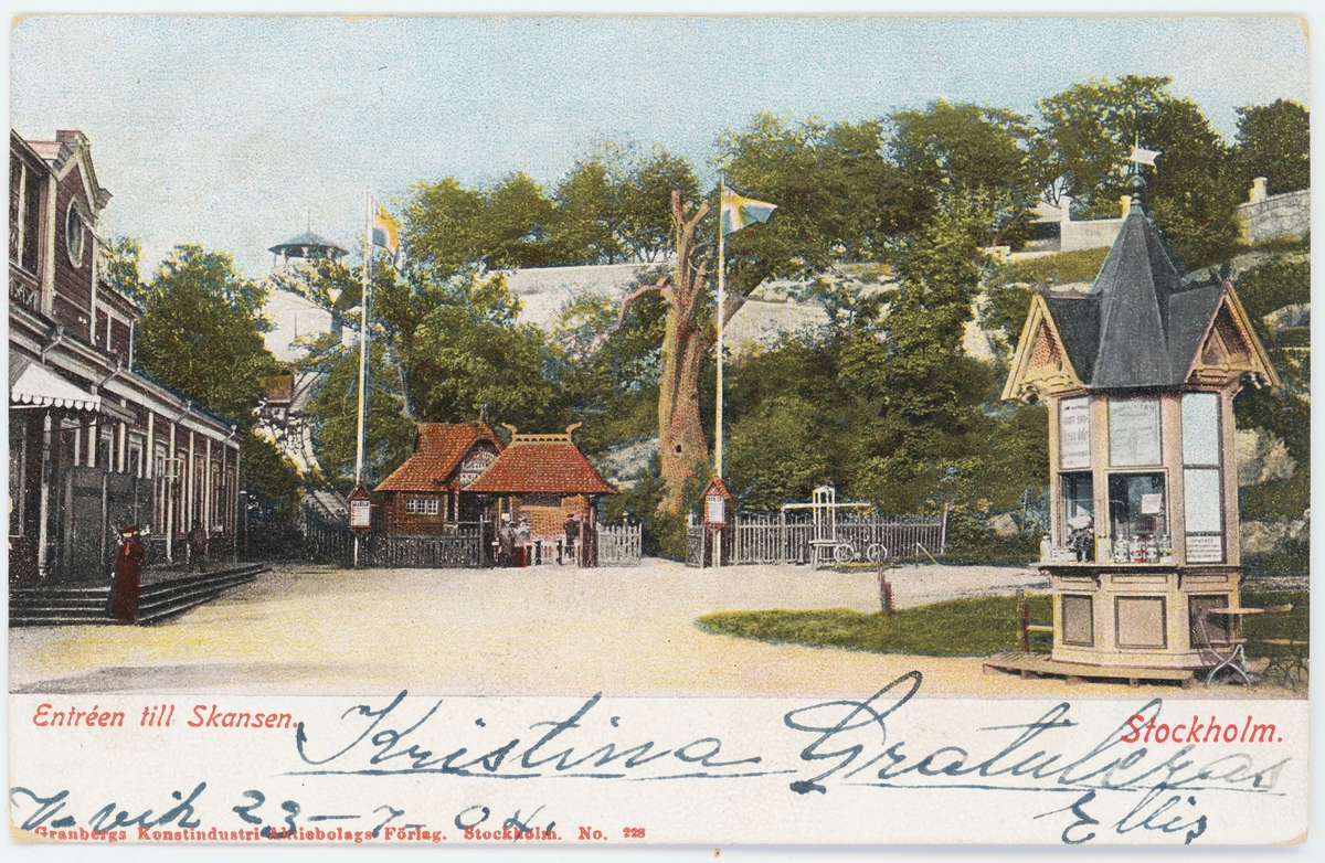 Vykort med motiv från Skansen. Entréen till Skansen vid Bergbanan. Till vänster Djurgårdsteatern, till höger en kiosk. Kolorerat vykort.