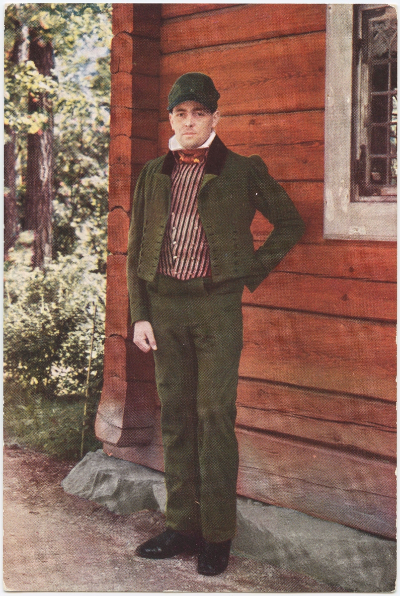 Vykort med motiv från Skansen. "Helgdagsdräkt. Länna socken, Uppland."