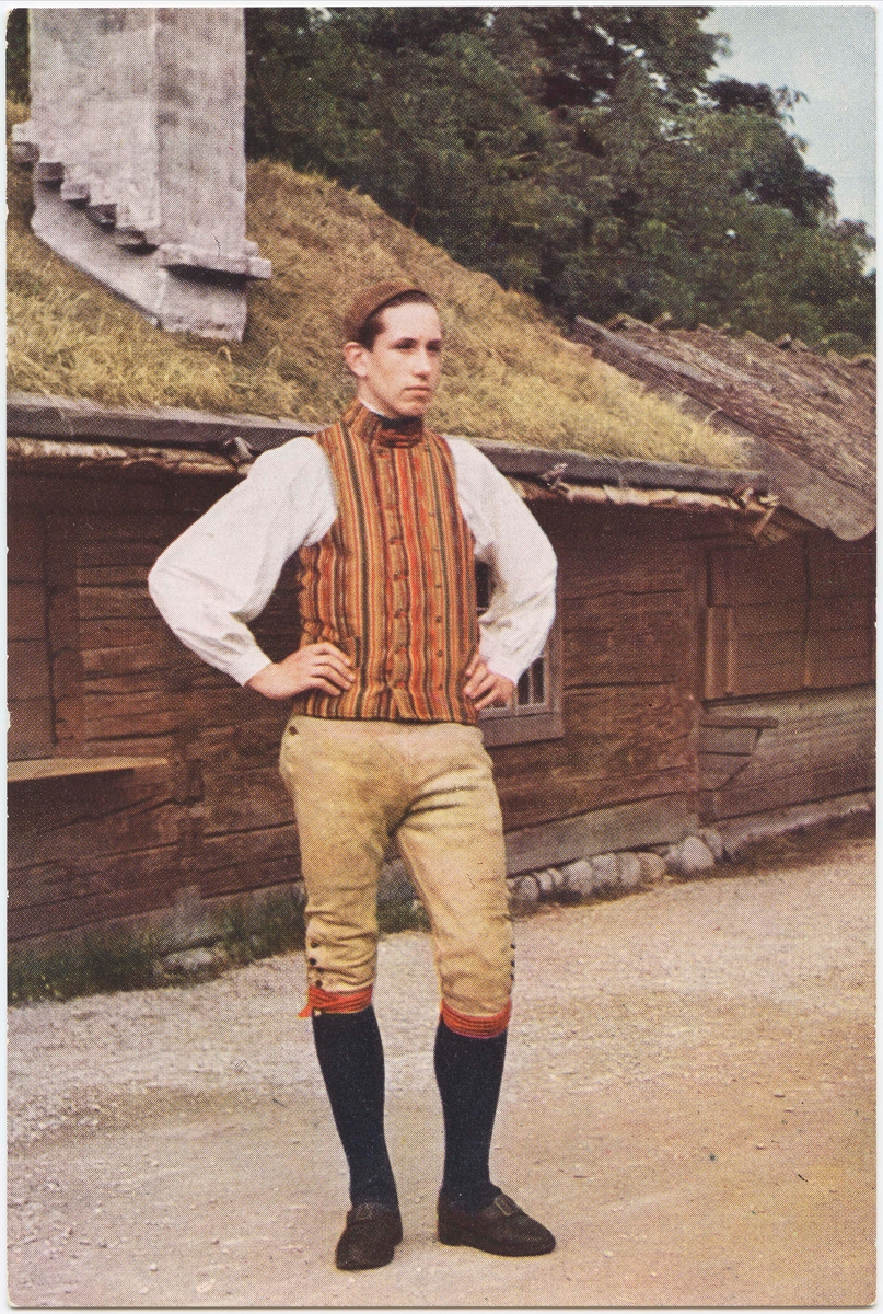 Vykort med motiv från Skansen. "Helgdagsdräkt. Unnaryds socken, Småland. Vid Marknadsbodarna."