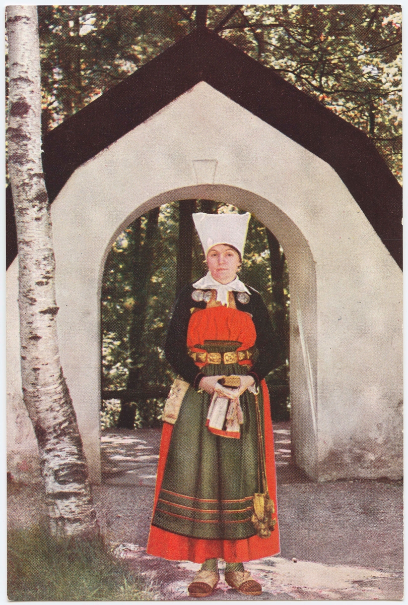 Vykort med motiv från Skansen. "Högtidsdräkt för hustru. Vingåkers socken, Södermanland. På Seglora kyrkogård."