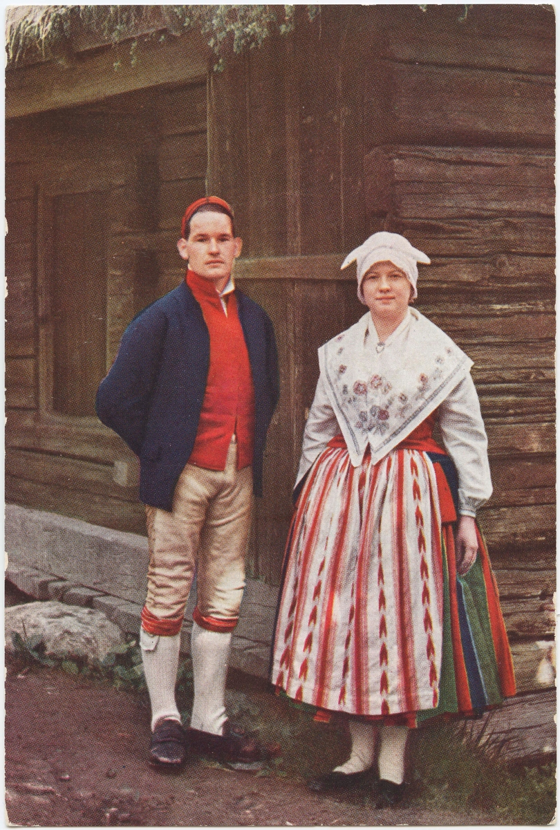 Vykort med motiv från Skansen. "Helgdagsdräkter. Östervallskogs socken, Värmland. Vid Ransätersboden."