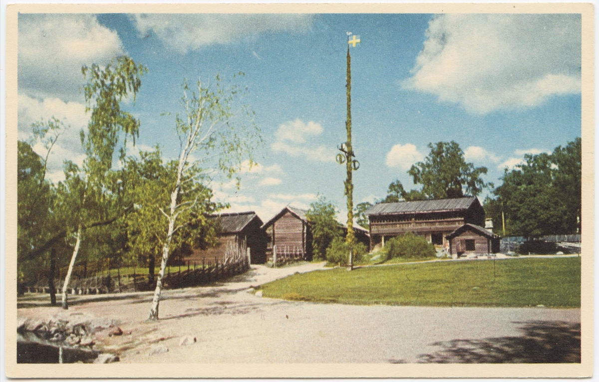 Titel: Vykort med motiv från Skansen. "Majstången vid Moragården"