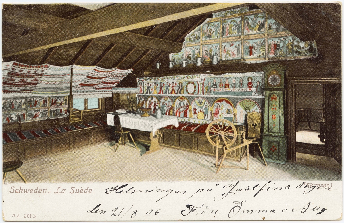 Titel: Vykort med motiv från Skansen. Interiör Kyrkhultsstugan.