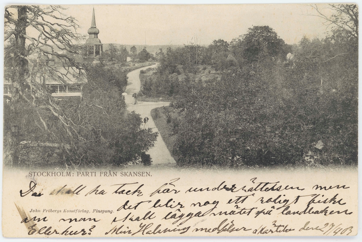 Titel: Vykort med motiv från Skansen. "Parti från Skansen". I bakgrunden Håsjöstapeln.