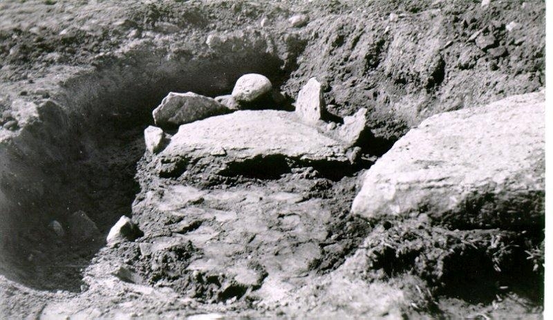 Grav nr 2 vid undersökningens början. Täckhällen avbruten, ena halvan lagd åt sidan, andra halvan ligger kvar på den gravlagde. Undersökning 1/5 1942 av Hilding Svensson, Falköping.