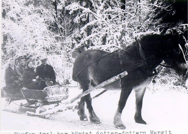 Morfar Axel har hämtat dotterdottern Margit och barnbarnsbarnen Gunnel och Birgitta vid bussen.
