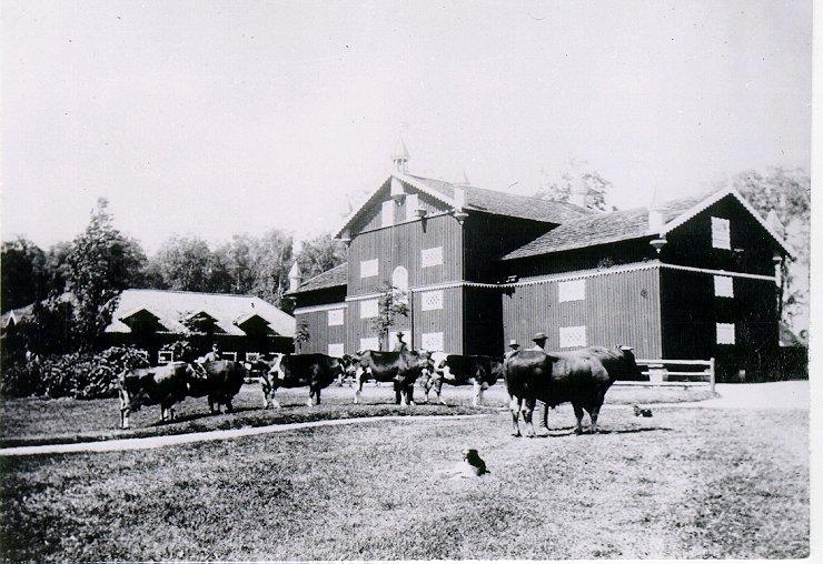 Utställningsdjur tränas framför magasinet, till vänster skymtar mittenpartiet av stallet.