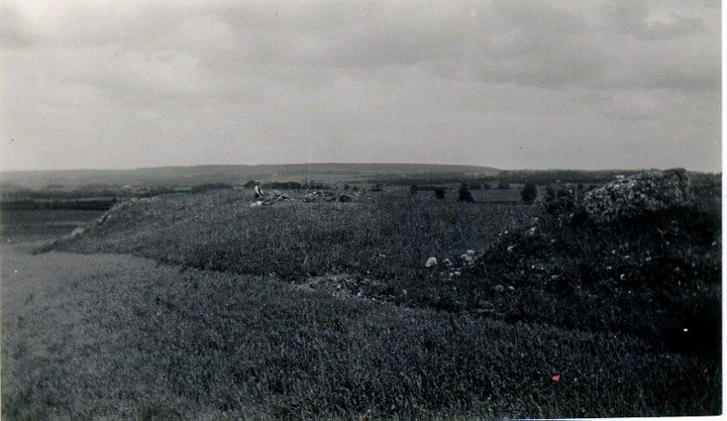 Utgrävning av varggrop med intilliggande skelettgrav juni 1934 av H. Svensson och H. Widéen. Bild på utgrävningsplatsen på toppen av en åsrygg.