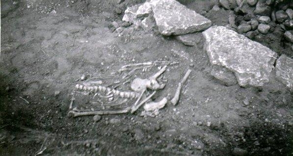 Utgrävning av varggrop med intilliggande skelettgrav juni 1934. Varggropen består av stensatt grop där väggarna kallmurats. Gropen har senare fyllts med odlingssten.