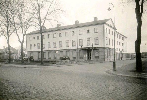 Kv. Midgård, S:t Olofsgatan 26. Stora Hotellet, Falköping. Den 29 maj 1923 motionerades om uppförandet av ett tidsenligt hotell i staden. Ritningar utarbetades av arkitekterna Båld, Borås och Ture Svanberg, Göteborg. Den 12 mars 1928 konstituerades hotellaktiebolaget Midgård och den 1 nov. 1929 stod Stora Hotellet färdigt. Det hade då dragit en kostnad av 640 000 kr. År 1967 genomfördes en omfattande om- och tillbyggnad. Ovanstående foto är från omkring 1935, i varje fall före tillbyggnaden för posten år 1939.