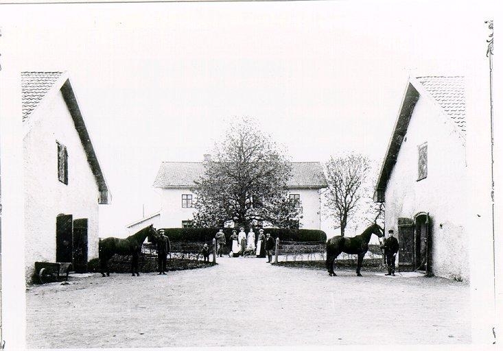 Gudhems kungsgård. Gudhem i början av 1900. Kusken heter Lång. Sigge och Alfrida Stenbeck med dottern Britta i vagnen. Damen vid hunden torde vara Sandra Karlsson.