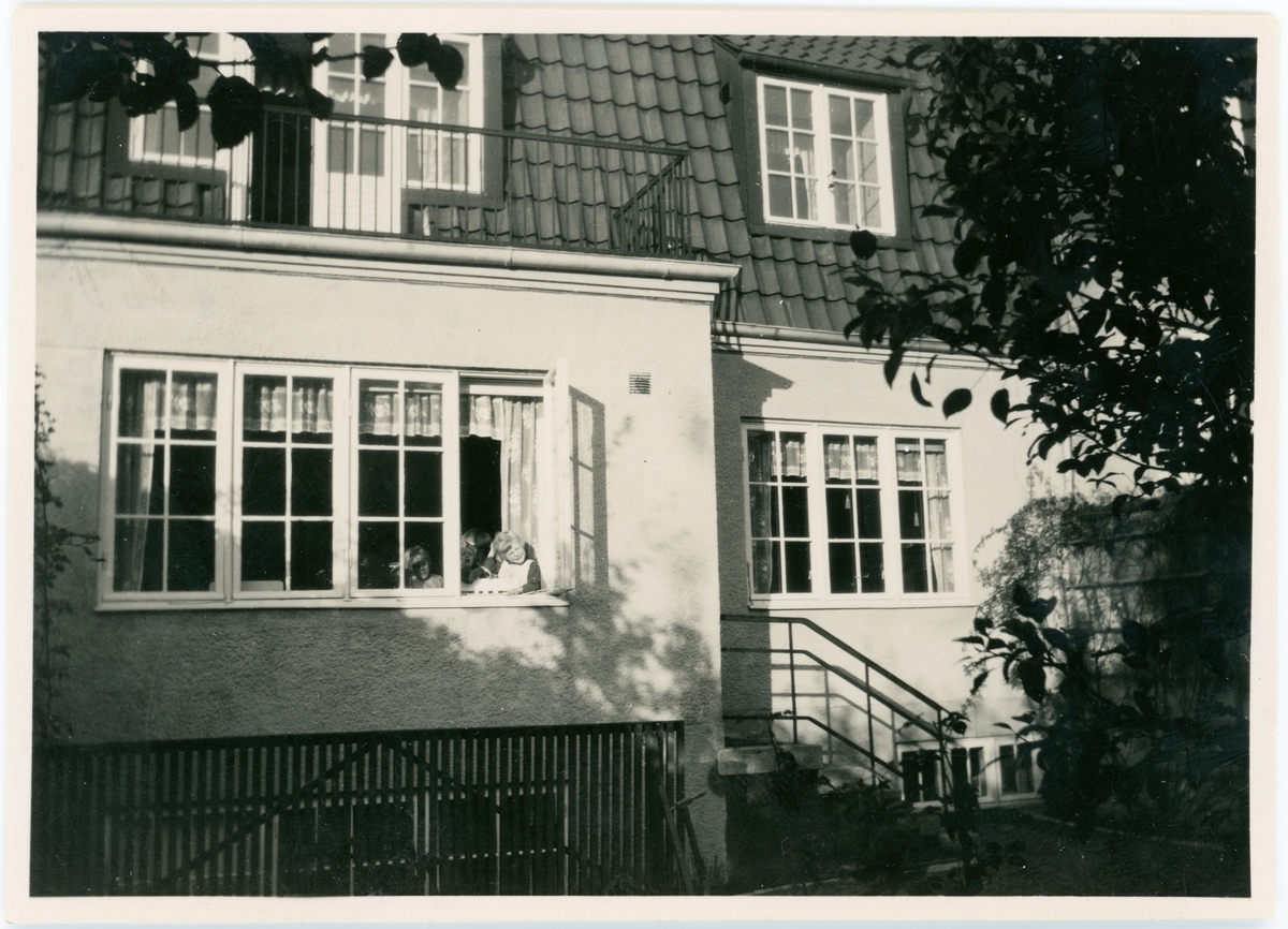Göteborg. "Skolhemmet för dövstumma småbarn". Barn som tittar ut från ett fönster