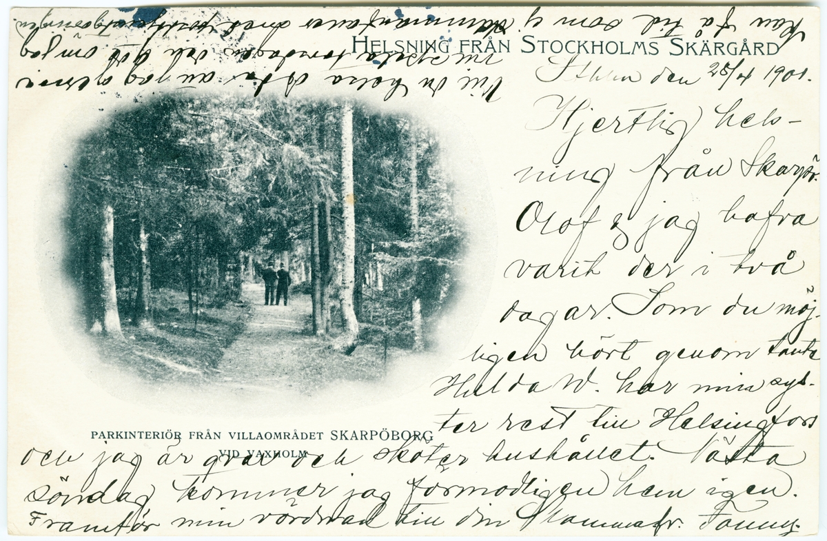 Stockholms Skärgård. "Helsning från Stockholms skärgård, parkintreiör från villa området Skarpöborg vid Vaxholm"