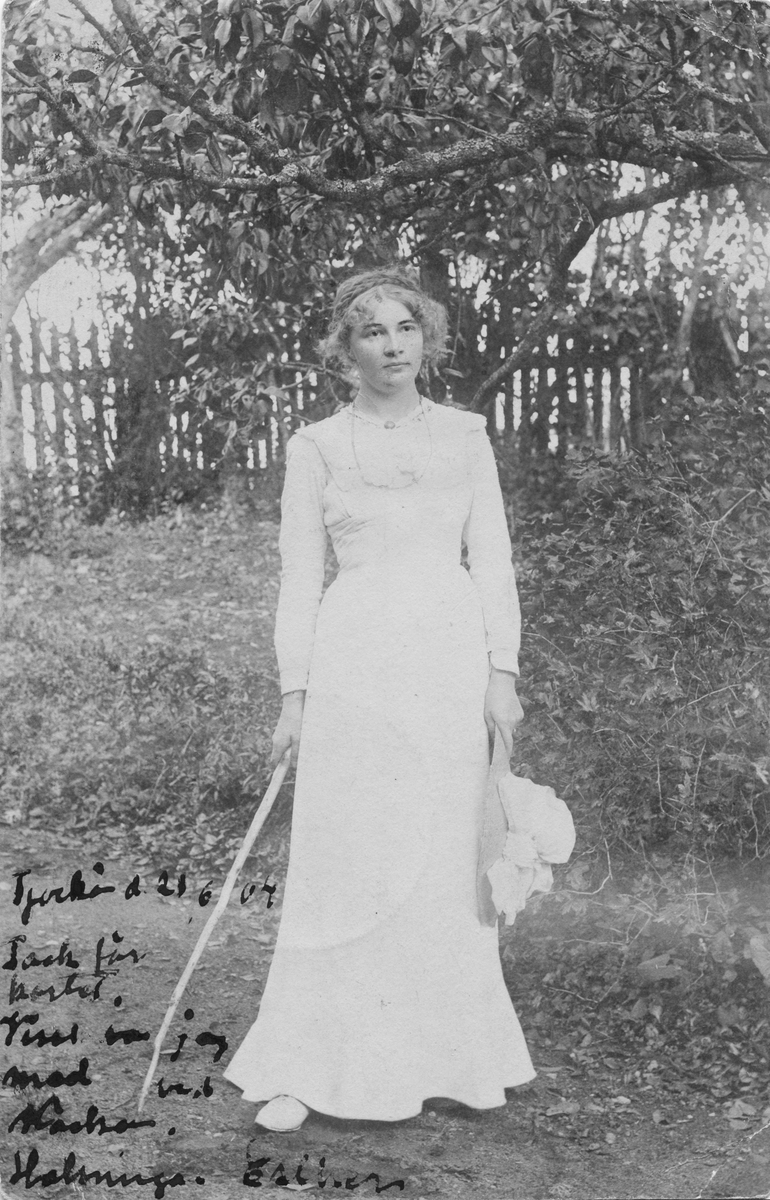 Ett brevkort med Ester Ellqvist-Bauer på Tjockö utanför Stockholm som motiv.