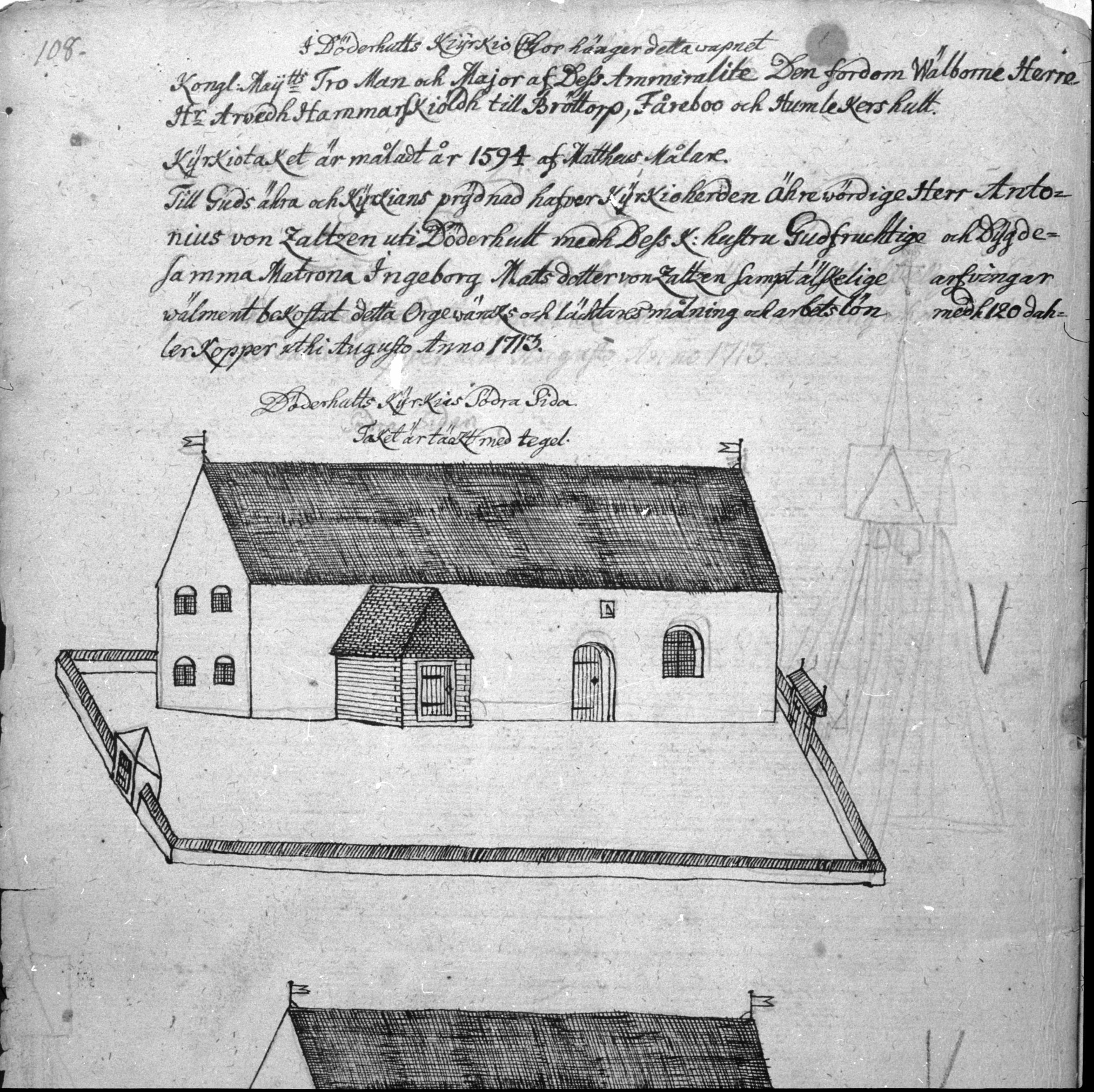 Skiss över den nu rivna kyrkan. Frigeliana, Kalmar högre allmänna läroverks bibliotek.