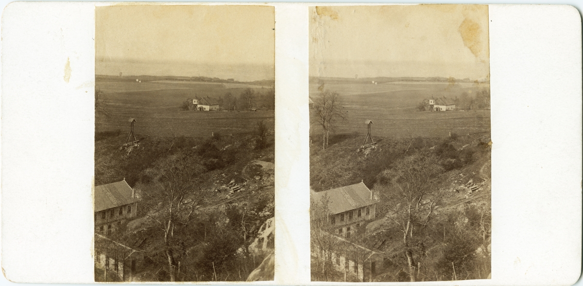 Titel: Utsikt från backen ovanför de nya fabrikshusen i Huskvarna, över gärdet, lilla kapellet och längst ned Rosendala.