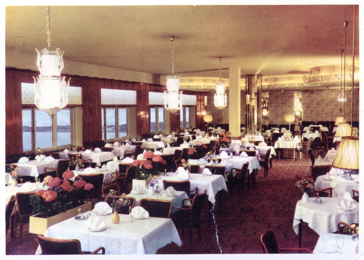 Ett vykort med motiv från Stora hotellet i Jönköping. Matsalen är dukad inför Diligensbalen den 10 juni 1955.
