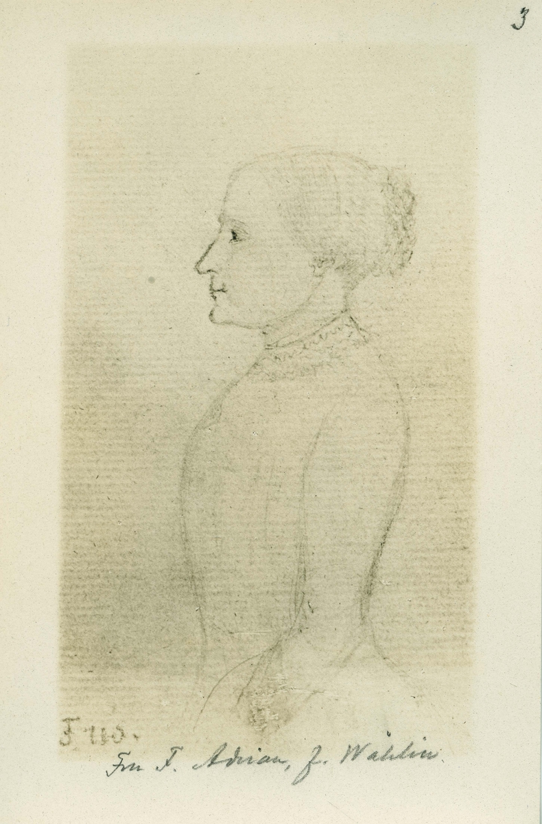 Tecknat porträtt av Fredrika Charlotta Adrian, fru till Hovpredikant Samuel Adrian.