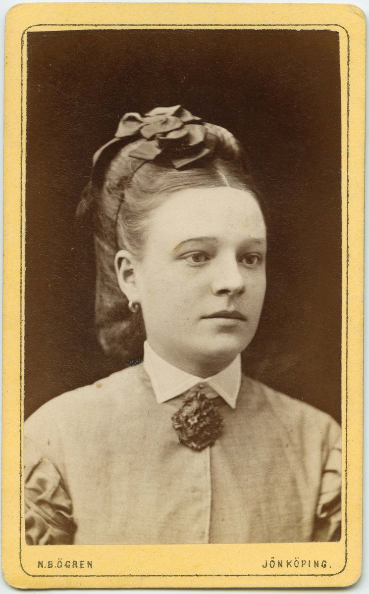 Porträtt på fru Anna Bergsten. Gift med fanjukaren Bergsten, Smålands Husarregemente.