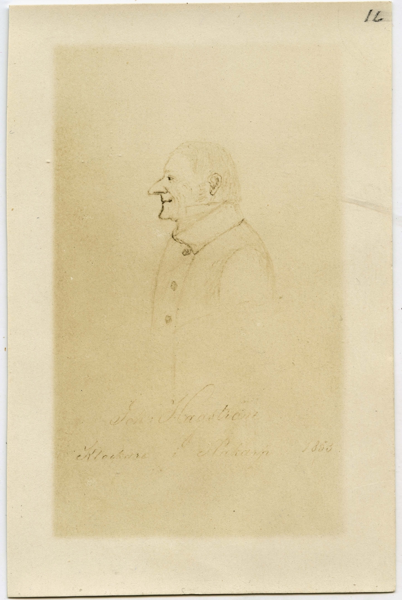 Porträtt handtecknat på Klockare Johan Hagström i Hakarp, Huskvarna. Född 21 december år 1789 i Hakarp död 25 februari år 1886 i Hakarp