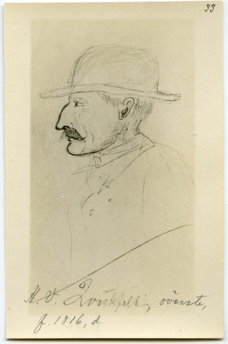 Tecknat porträtt på Överste Henrik Vilhem Queckfeldt. Född 8 december år 1816 på Billa i Hemsjö socken (Kron) död 15 oktober år 1899 i Kristianstad. Ägde Väståkra i St. Upåkra samt gård i Krisitianstad.