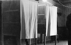Från folkomröstningen i Saar, januari 1935. En svensk trupp deltog i övervakningen och ett svenskt fältpostkontor inrättades i Saar. Vallokal med skärmar.