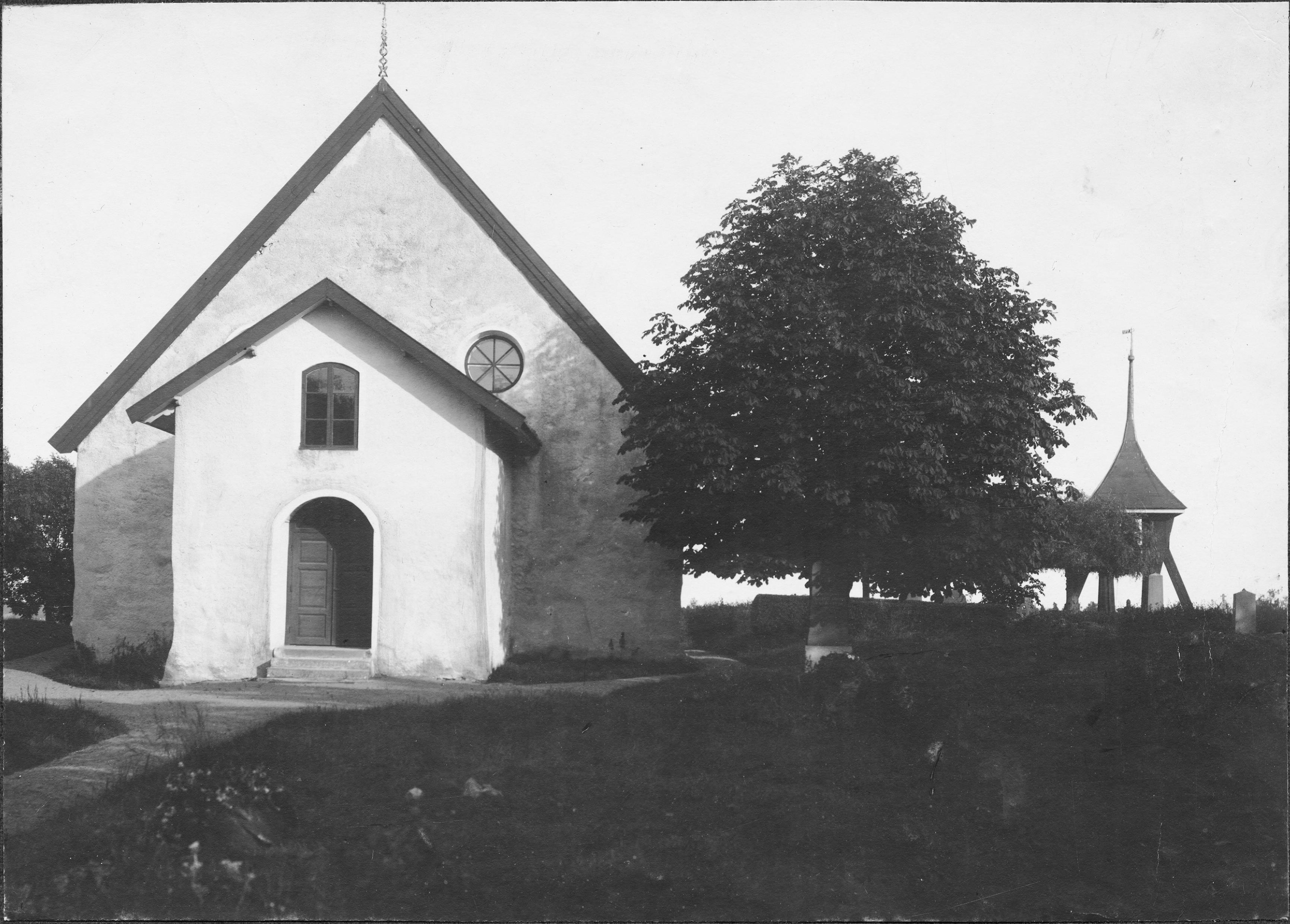 Kyrkan och klockstapeln från väster. Foto från omkring 1900.