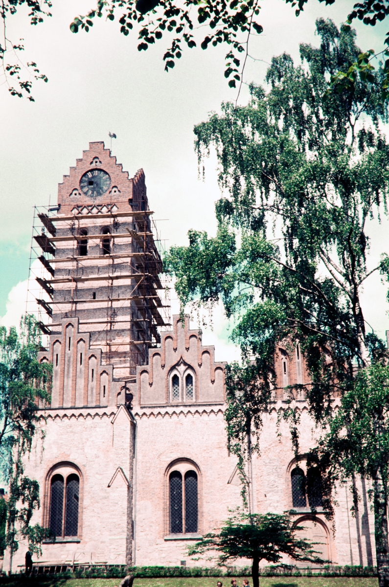 Växjö domkyrka, restaurering 1956. Södra fasaden. En byggnadsställning är rest runt tornet.