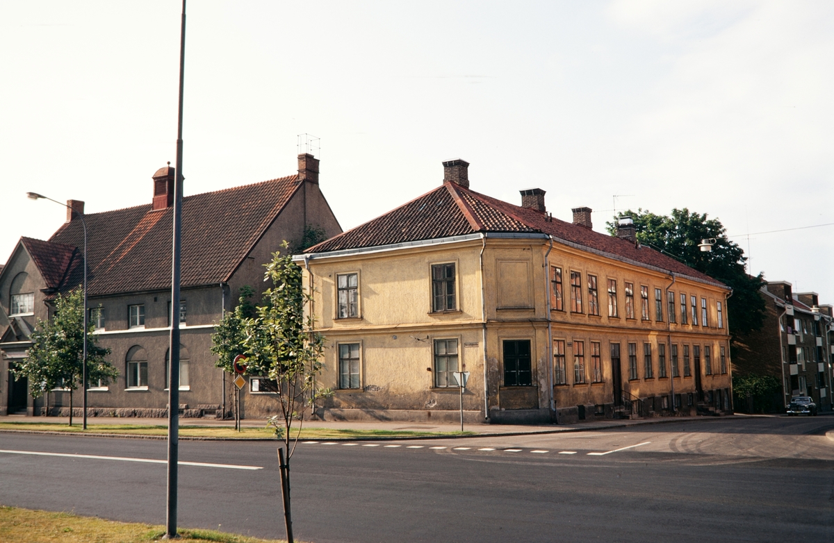 Frälsningsarméns fastighet i hörnet Norra Esplanaden / Klostergatan. Växjö, 1974. Sett från gatan.