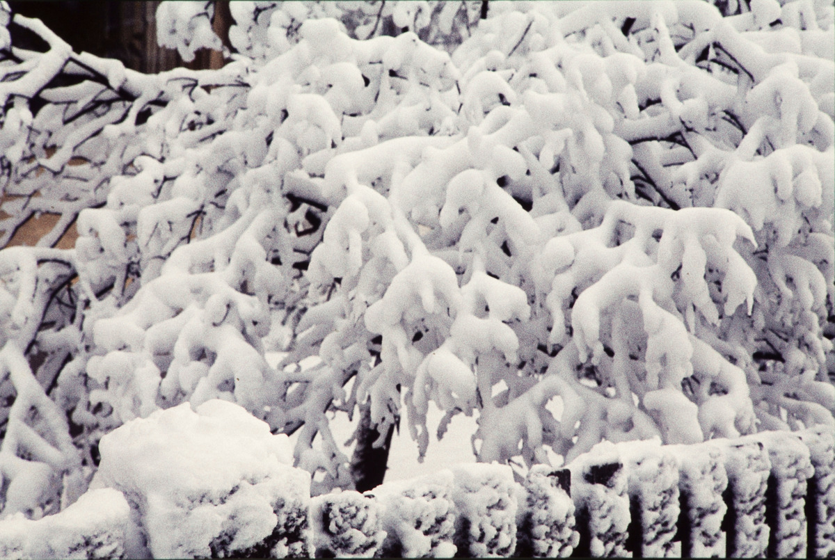 Snöklätt träd och staket. Ekelundsgatan i Växjö, 1960.