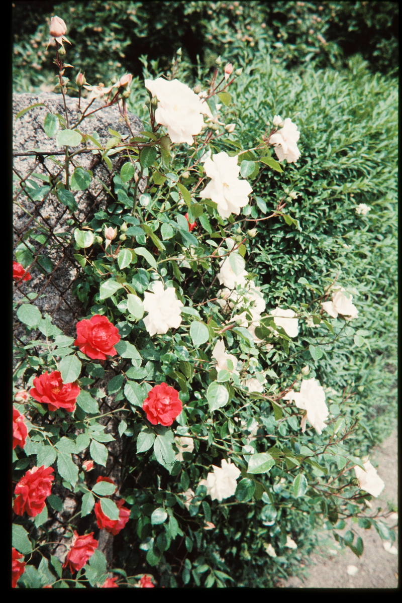 Röda och vita rosor mot ett stängselnät på Väster i Växjö. Sent 1950-tal.