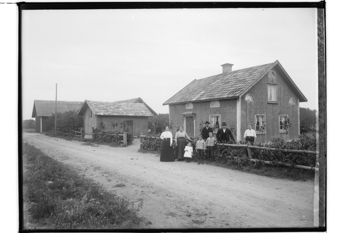 Titel: En och en halvplans bostadshus, en flygelbyggnad. 8 personer framför huset. Ludvig Andersson.