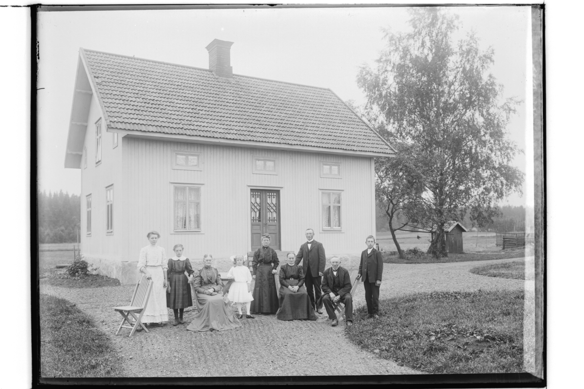 En och en halvvånings bostadshus, nio personer framför huset.