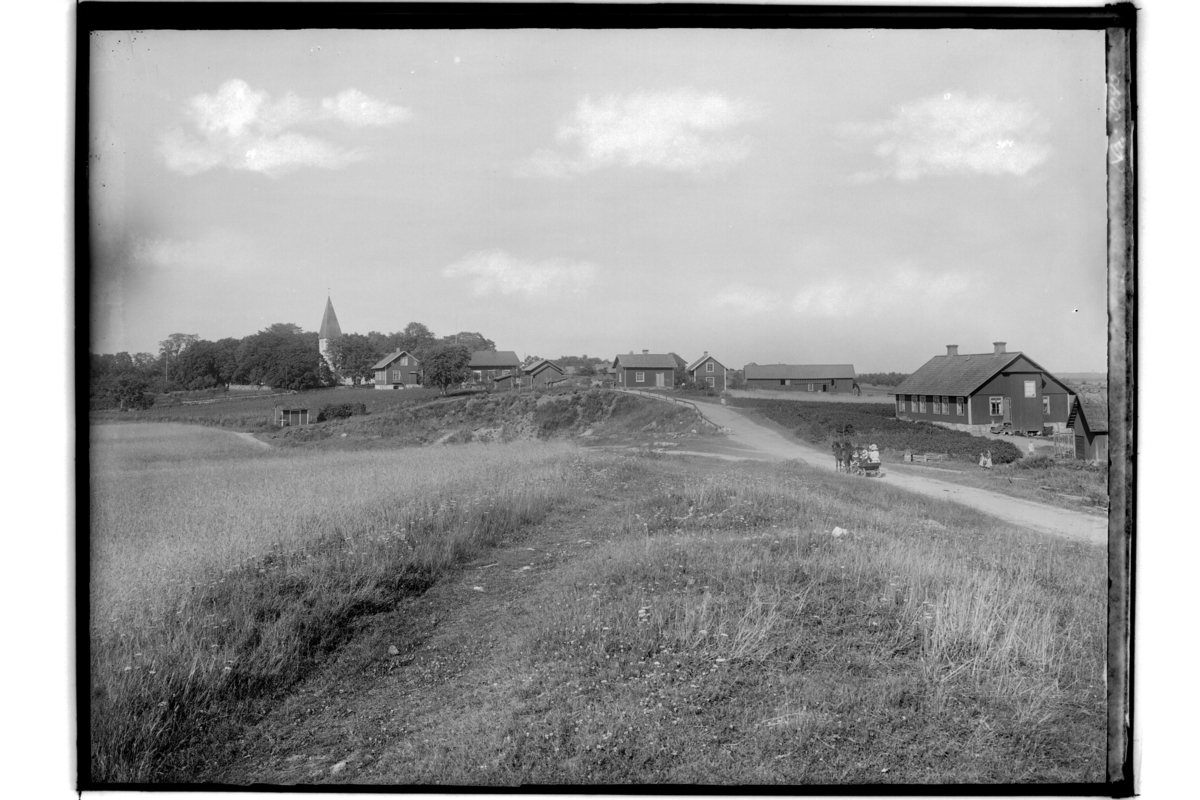 Vy över Norrbyås från Kvismarevägen, kyrkan och byggnader.