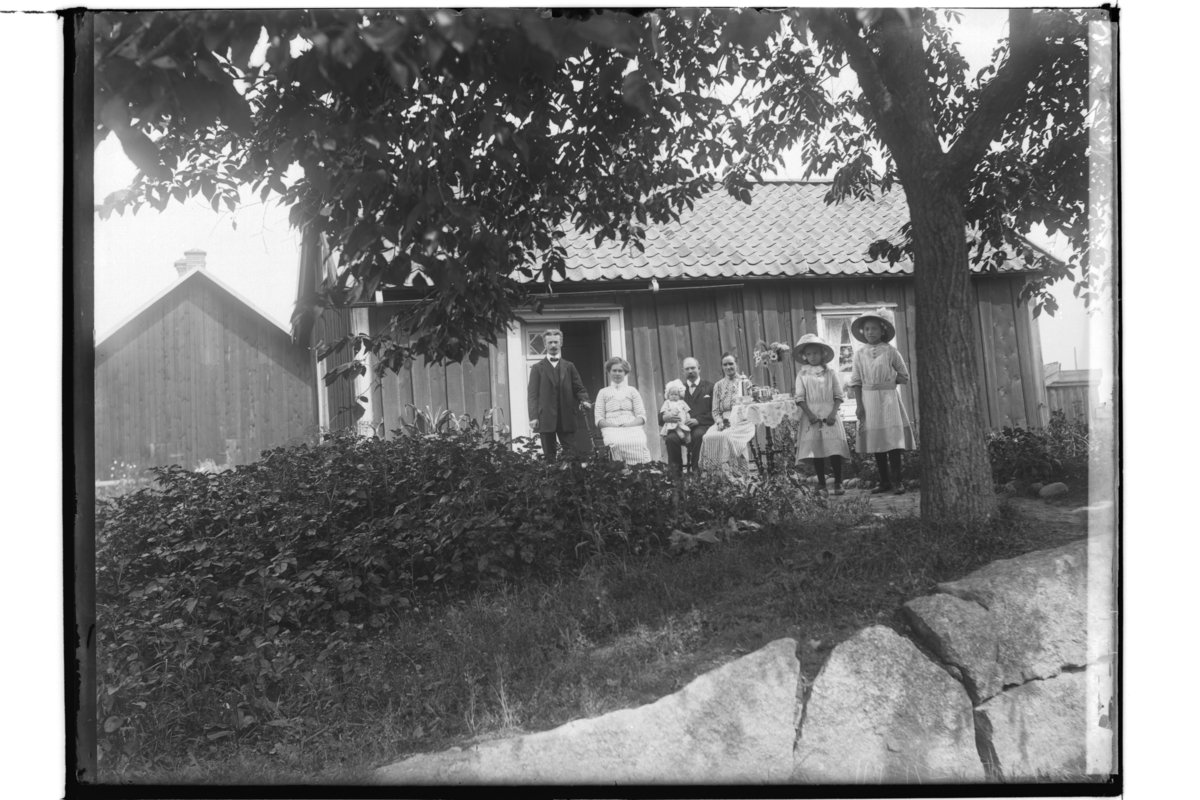 7 personer vid kaffebordet framför stugan.