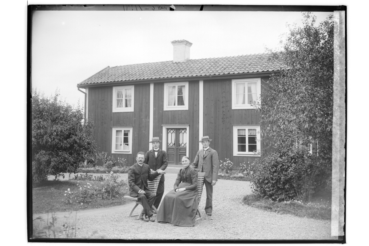 Tvåvånings bostadshus, familjegrupp 4 personer framför huset.