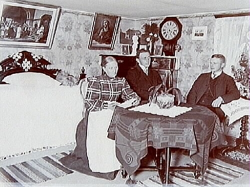 På bilden, som är tagen inne i stugan på Landåsen i Mosås, syns Kristina Andersson (född Pettersson), också kallad "Mor Kristina" samt två av hennes söner: Josef Forsgren (i mitten) och David Landé (till höger). "Mor Kristina" hade tre söner Gerard Landé, Josef Forsgren och David Landé. (Gerard finns inte med på bilden).