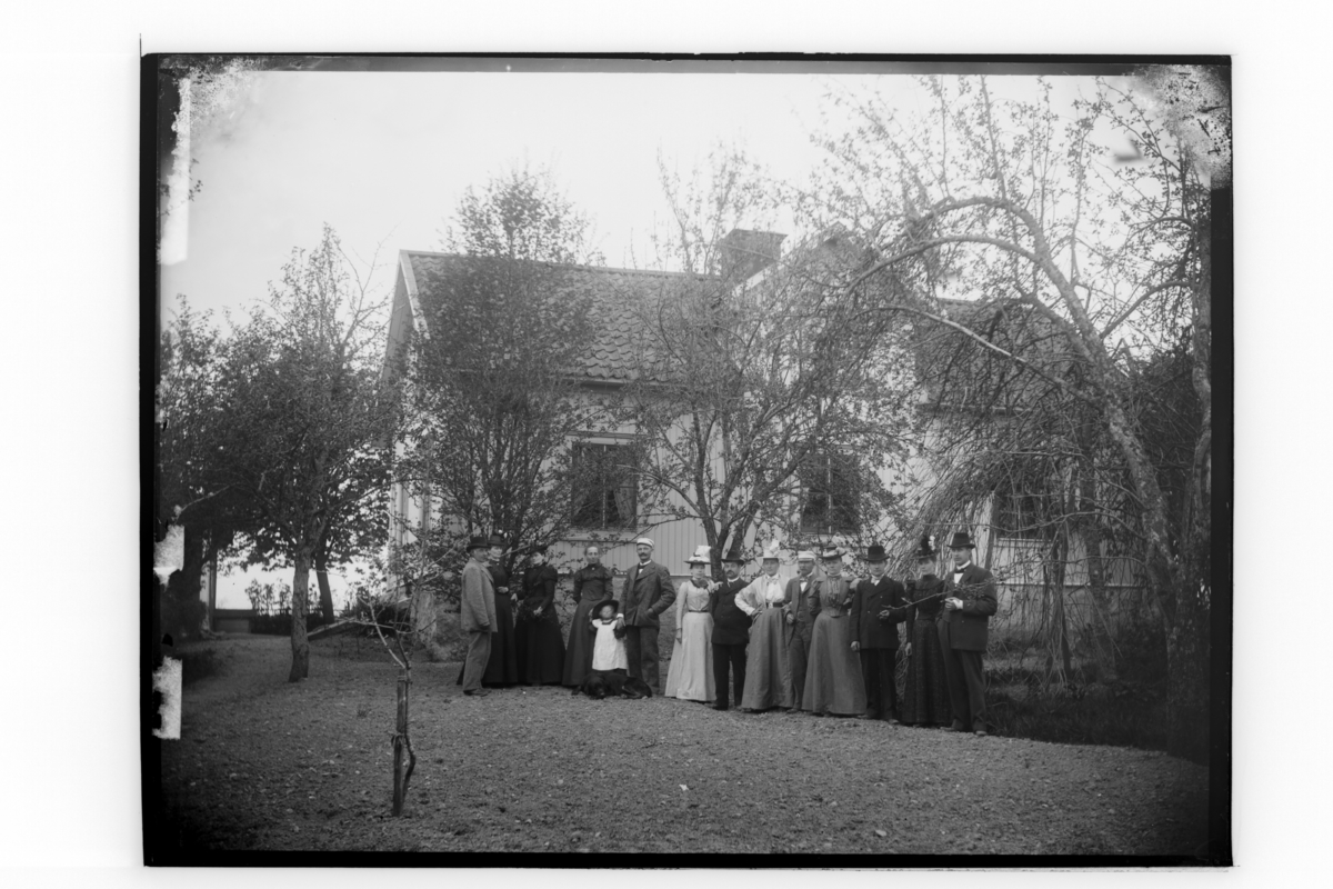 Titel: Bostadshus, 12 personer framför huset. Carl Sahlin