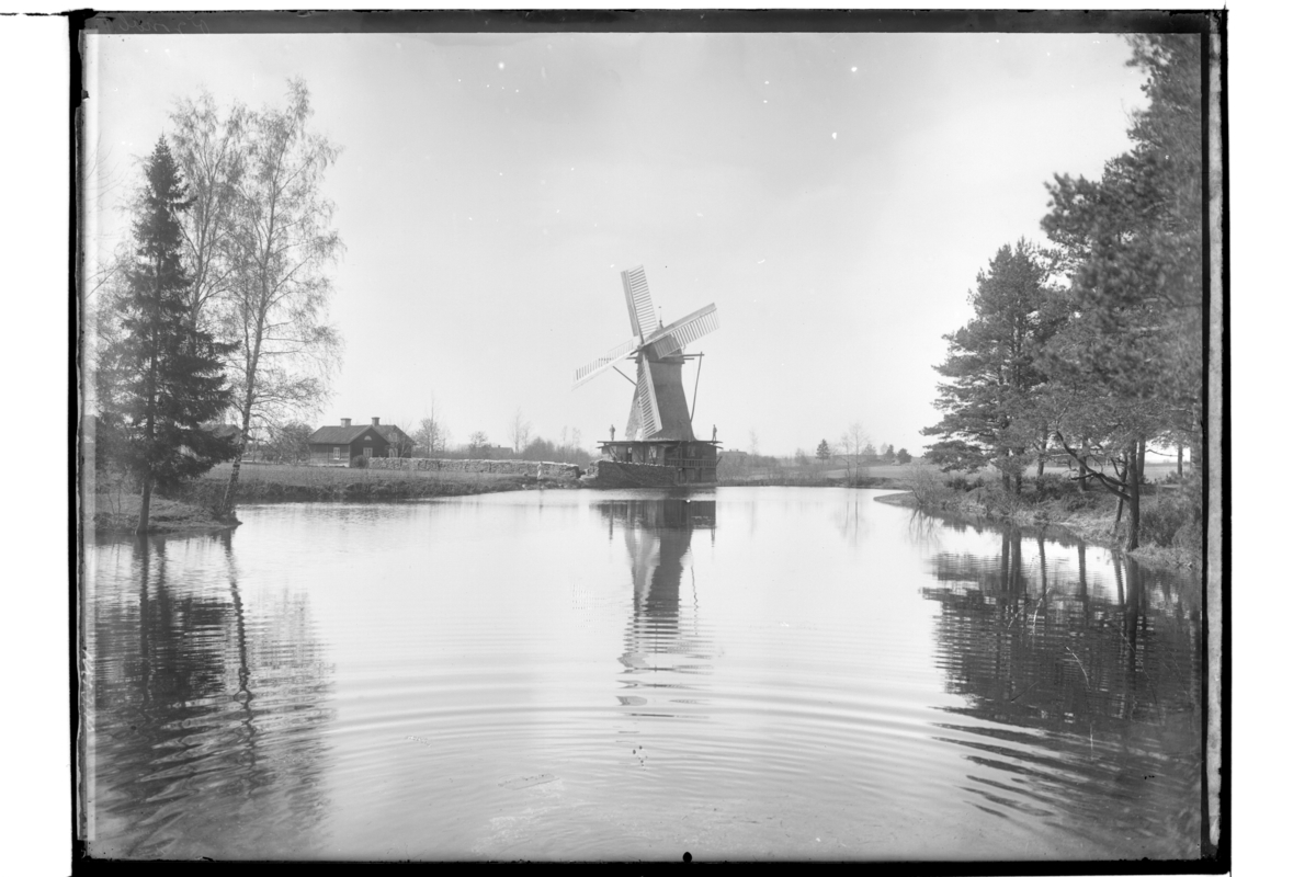 Kånsta vatten- och väderkvarn. Envånings bostadshus till vänster om kvarnen.