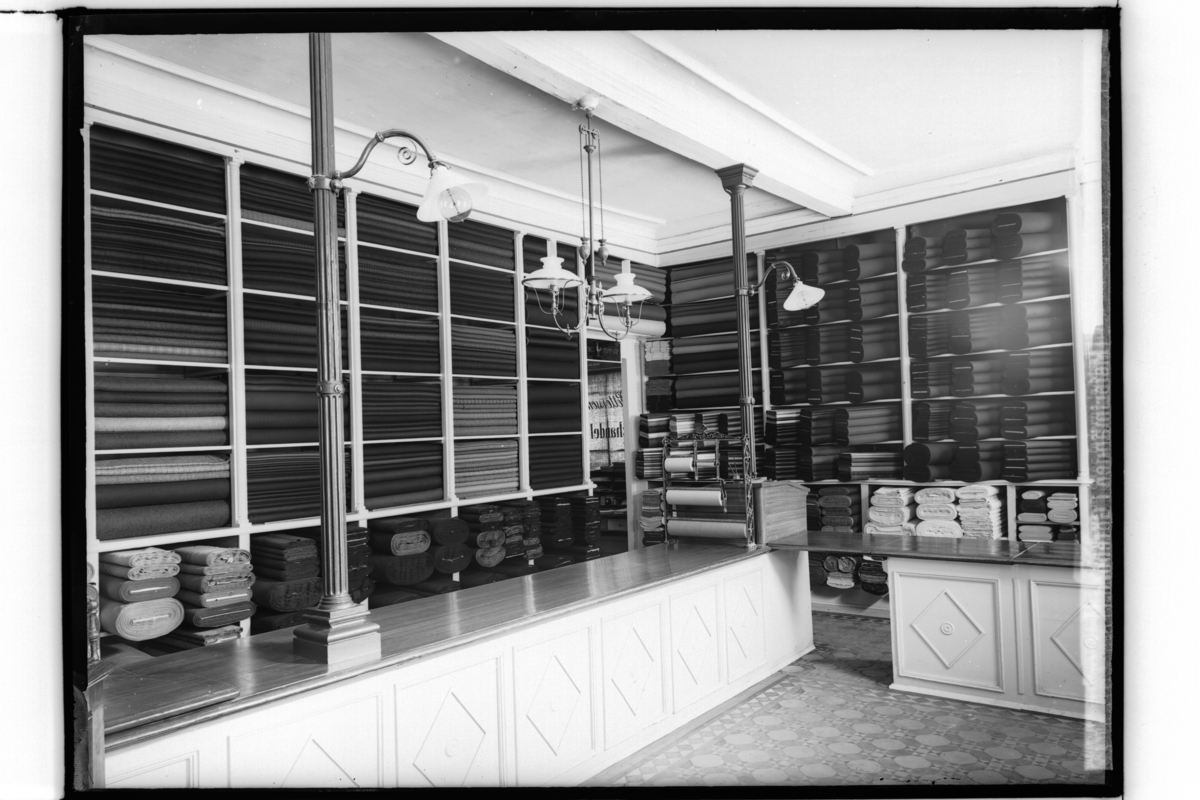 Affärsinteriör, hyllor med tygstuvar, diskar.