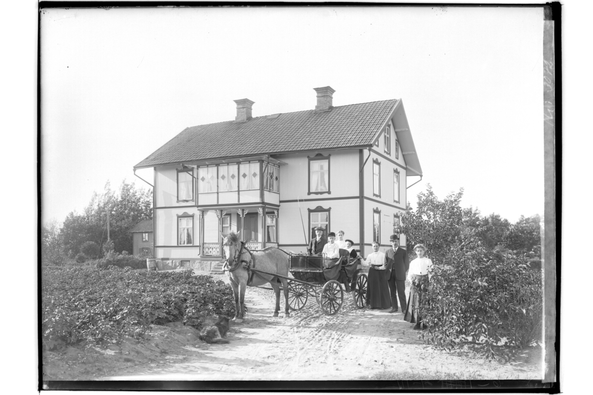 Tvåvånings bostadshus, 7 personer, häst spänd för trillan.