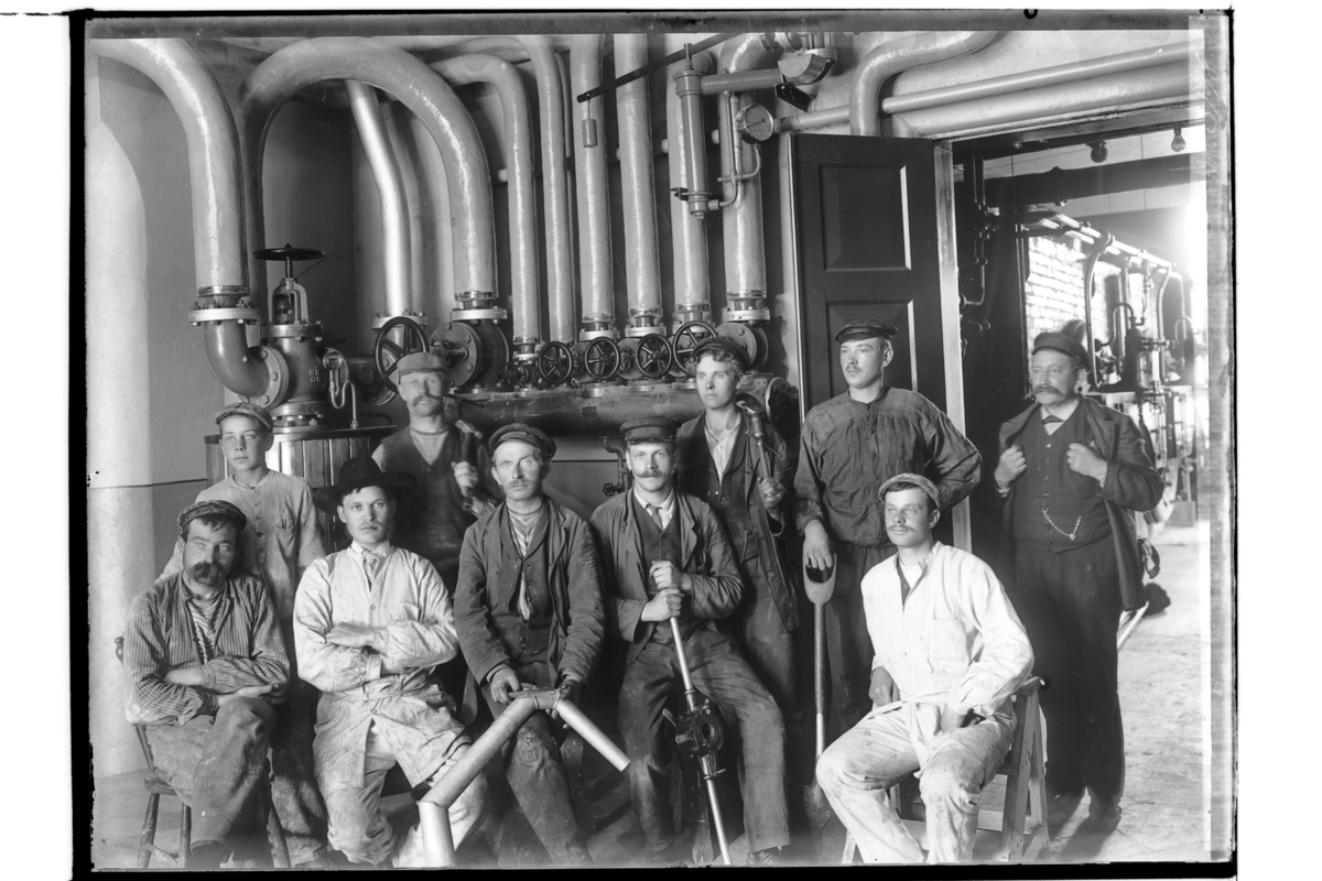 Lasarettet, 10 byggnadsarbetare i maskinhallen.