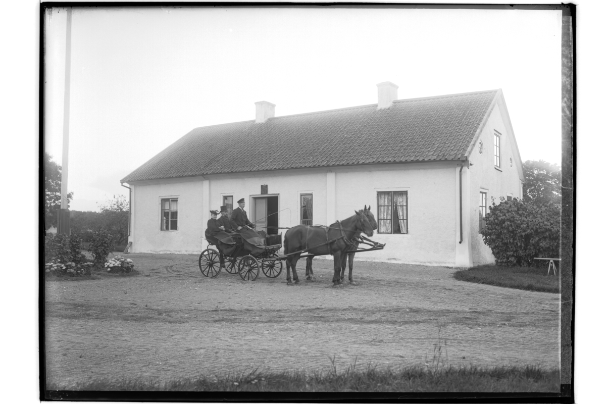 Lännäs Gästgivaregård, 1700-tals byggnad. Ett par hästar spända för droskan. En kusk och två åkande.