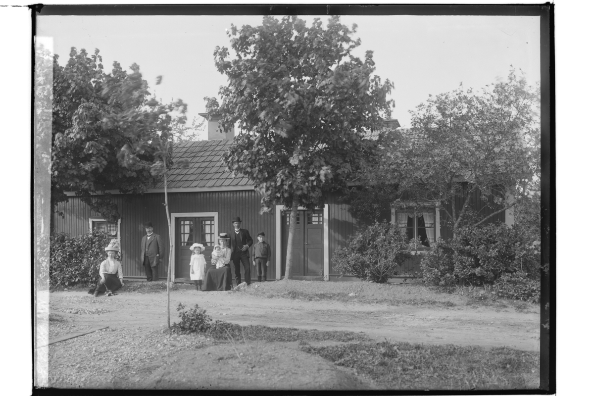 Envånings dubbelhus, 7 personer framför byggnaden.