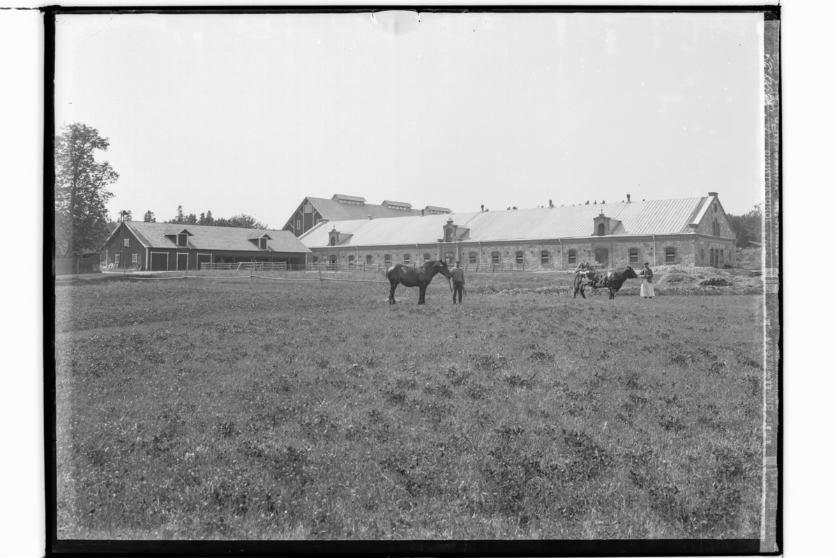 En man med en häst och en kvinna med en tjur framför ladugården.