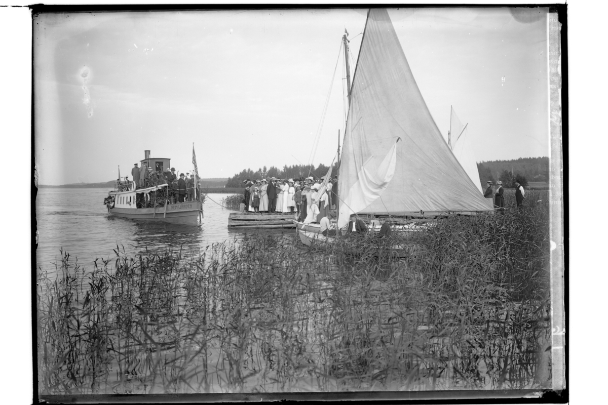 Ångslupen Hemfjärden vid Ekeby Ångbåtsbrygga, två segelbåtar.