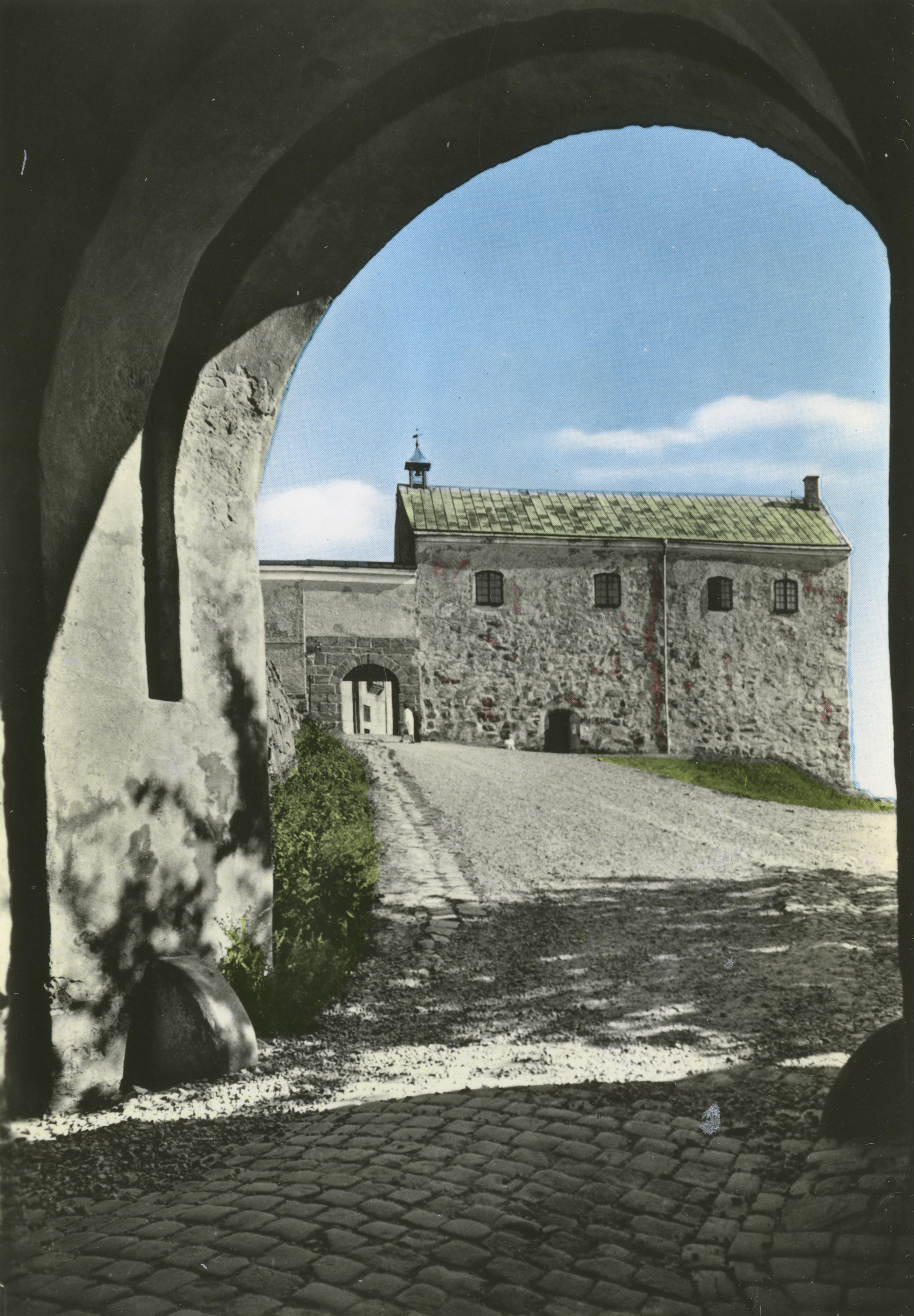 Parti av Varbergs fästning med museet. Handkolorerad variant av ac00751.